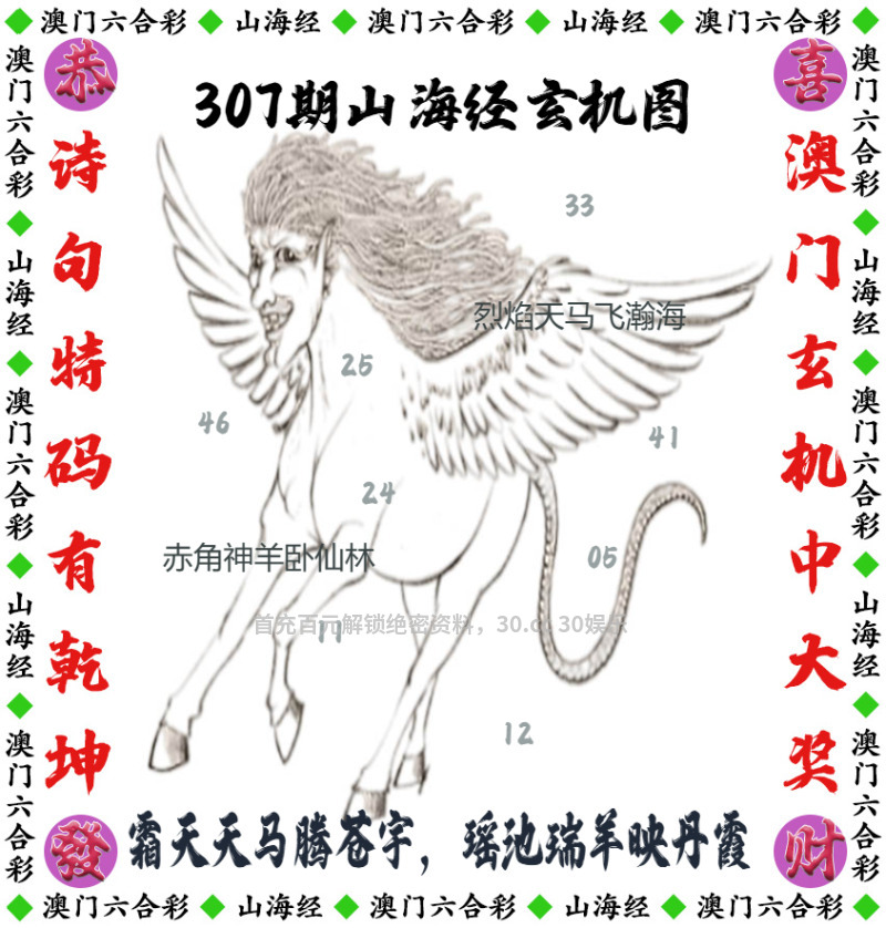 解释:烈焰天马飞瀚海,赤角神羊卧仙林解牛马猪