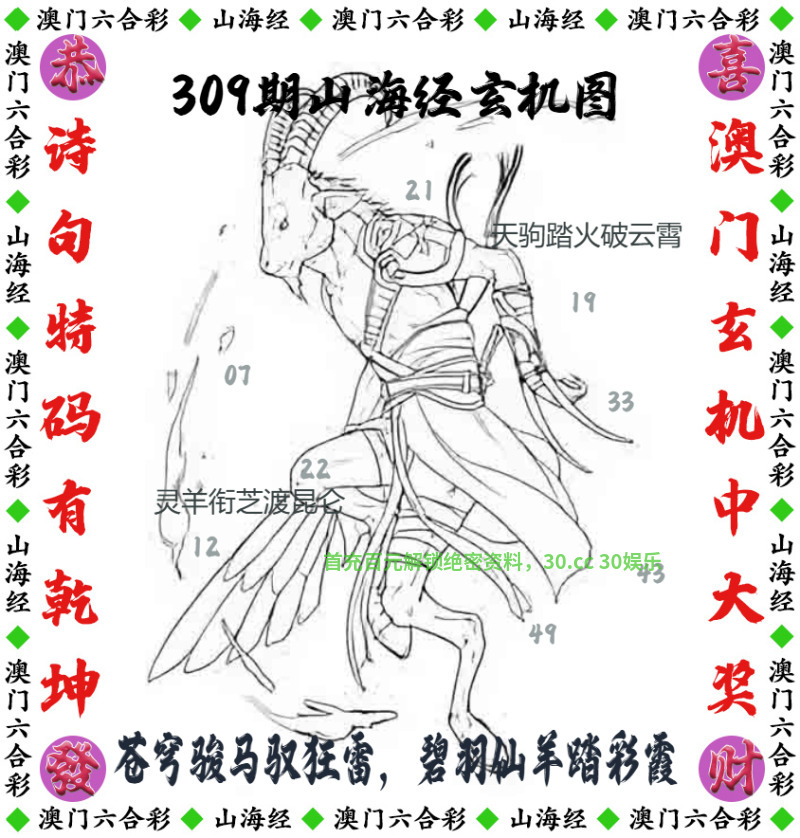 解释:天驹踏火破云霄,灵羊衔芝渡昆仑解猪鸡羊